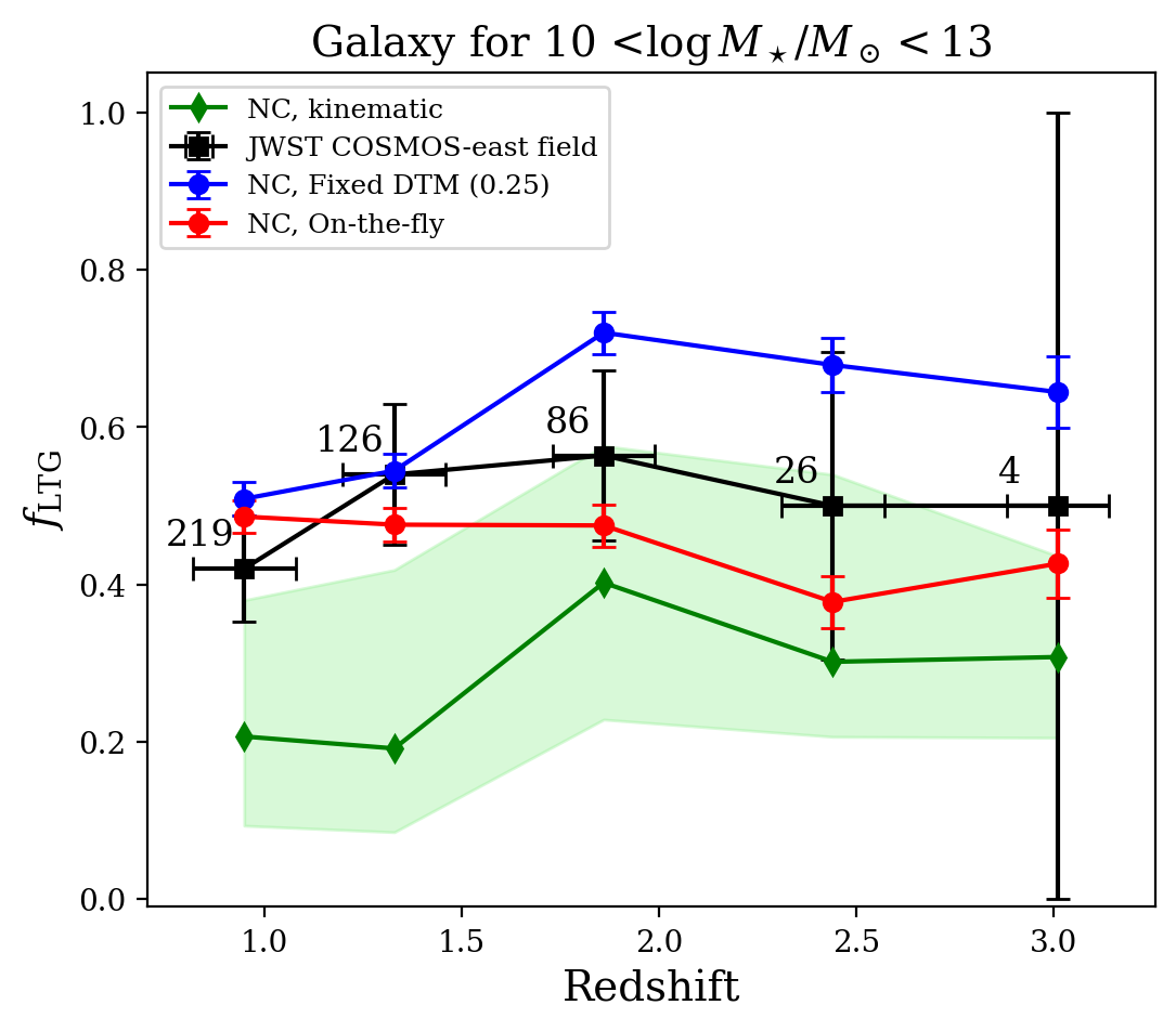 기존 우주론적 시뮬레이션에서는 고정된 먼지-금속 비율(DTM)을 가정해 먼지를 모델링해 왔으나, 최근에는 먼지의 시공간적 진화를 직접 추적하는 실시간(on-the-fly, OTF) 먼지 모델이 도입되고 있다. 본 연구에서는 OTF 먼지 모델을 구현한 NewCluster 시뮬레이션을 사용하여, 먼지 모델링 방식이 은하 형태에 미치는 영향을 분석하였다. OTF 모델과 고정 DTM 모델에 대해 복사전달 코드 SKIRT로 모의 관측을 하고, JWST 관측과 비교하였다. 또한 형태 지수와 G-M_20 분류를 이용해 은하 형태를 정량적으로 분석하였다. 그 결과, OTF 모델을 적용한 은하들은 고정 DTM 모델에 비해 중심부가 더 밝고 팽대부가 더 두드러지며, 특히 높은 적색편이에서 후기형 은하의 비율이 감소하는 경향을 보였다. 이러한 차이는 강한 중심부 별탄생에 의해 형성된 국소적인 DTM 감소 영역(‘DTM cavity’)과 관련이 있다. 본 연구는 은하 형태 연구에서 물리적으로 일관된 먼지 진화 모델링의 중요성을 보여준다.